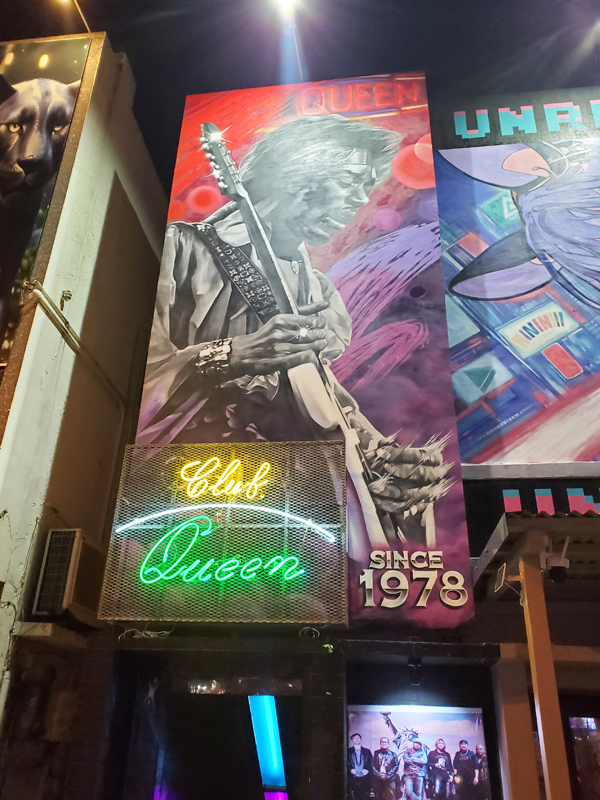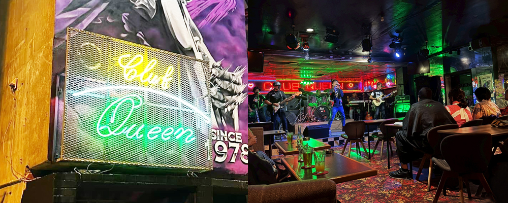 そんなハロウィンのにぎわいをよそに、こっちは地元で人気の老舗ライブハウス”CLUB QUEEN”へと。地下に伸びる暗い階段をネオンが怪しく照らし……てはいますが、重い扉の向こうでは、おばちゃんが給仕してくれるフレンドリーなライブハウスです。場所柄アメリカ人も来ていますが、一見さんも観光客でも気兼ねすることなく楽しめるはず。