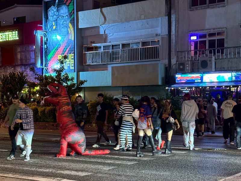 ウィークエンドがにぎやかなのはいつもながら、ふだんの土日の2倍増し3倍増しで盛り上がってる! 被りモノやコスプレの人、巨大な着ぐるみ姿もあちこちに。フリードリンクを振る舞う店から歩道まで人が溢れ返り、胡屋十字路付近にはパトカーがピーポー……。喧騒は夜が更けるほど広まり、国籍問わず多くの方が楽しまれているよう。ハロウィンのことなど、まったく意識してこなかったものの、ゲート通りまでやって来てみて、この界隈では特別な行事だったのかもしれないと感じた次第です。